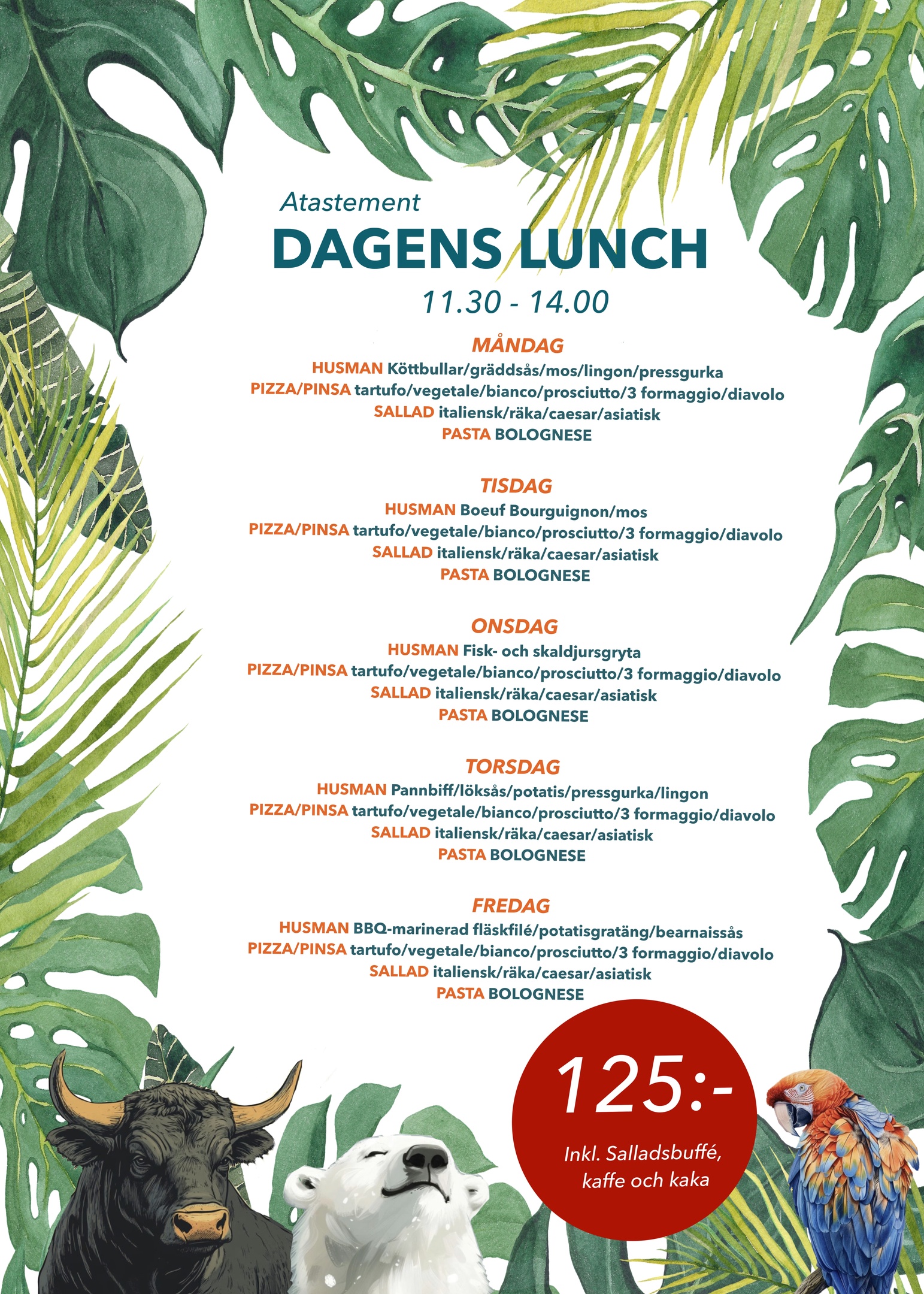 Vardagar mellan 11.30 och 14.00 erbjuder vi dagens husman, pasta ragu, flera olika sallader och pinsa.